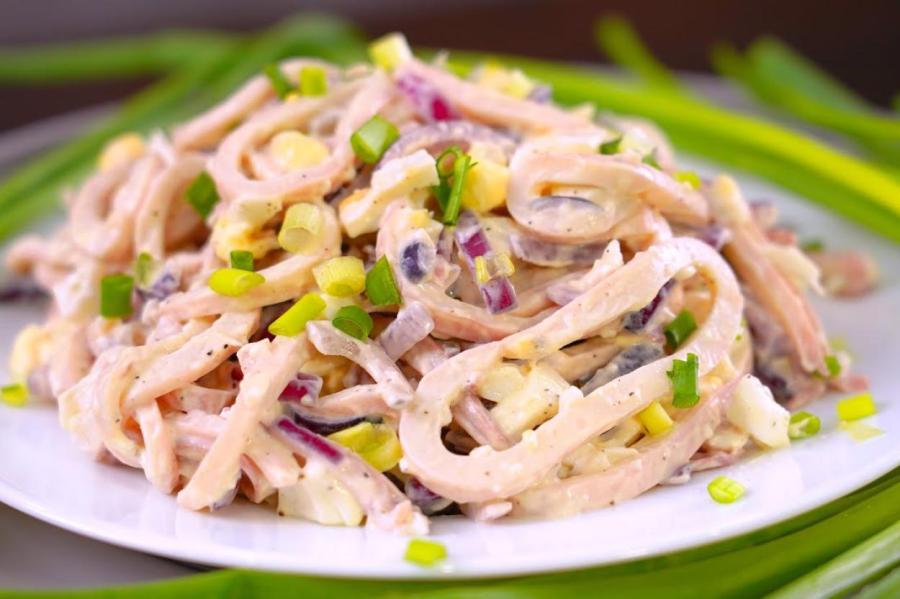 2. Отварите кальмары и нарежьте их соломкой. Яйца нарежьте кубиками.