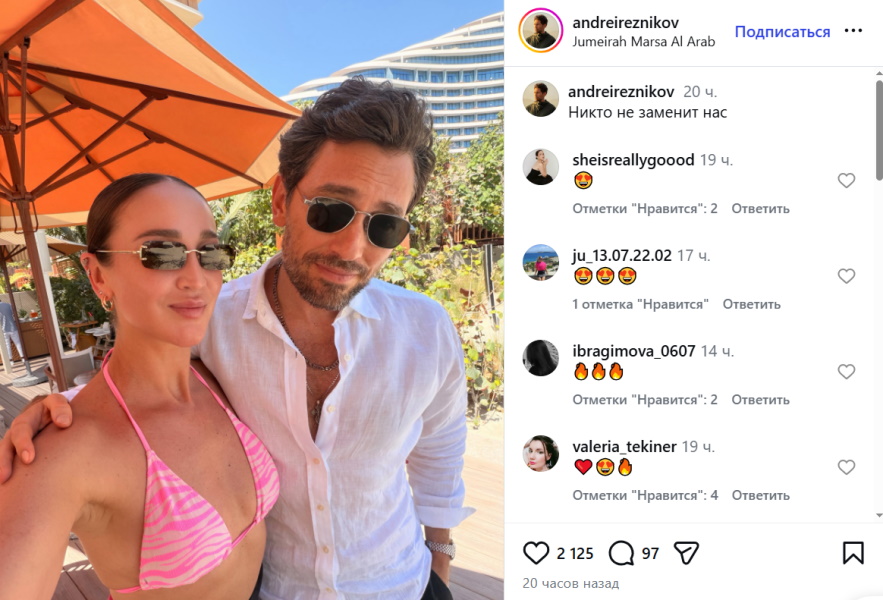 Парочка охотно позировала на камеру, причем дело было явно на отдыхе. Бузова нежно прильнула к своему успешному, молодому и красивому спутнику, которого тут же записали в ее бойфренды. «Никто не заменит нас», – лаконично написал Андрей Резников, что только подстегнуло фантазии сплетников.